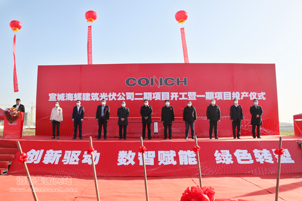 2022年12月15日,宣城海螺建筑光伏公司二期項目開工暨一期項目投產(chǎn)儀式在宣城舉行。宣城市委書記孔曉宏,市委副書記、市長何淳寬,海螺集團(tuán)黨委書記、董事長楊軍出席儀式。宣城市政府秘書長鄭華、市委副秘書長李壽生、經(jīng)開區(qū)黨工委書記黎斌,海螺水泥總經(jīng)理李群峰,海螺環(huán)保總經(jīng)理李曉波,海螺新能源總經(jīng)理馬偉,股東代表褚衍玲、徐曉華,以及宣城市直有關(guān)單位和經(jīng)開區(qū)負(fù)責(zé)人、行業(yè)嘉賓、施工單位代表參加了儀式。