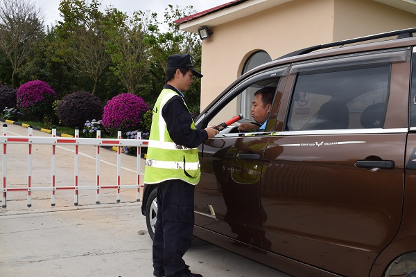 在保山海螺廠區(qū)門口,值班保衛(wèi)人員正在對進出廠車輛進行安全檢查?!爸形绾鸵归g,大家最容易麻痹大意、掉以輕心,作為治安保衛(wèi)人員,越是這種時候,越要打起十二分精神,不能懈怠?!北I胶B葜伟脖Pl(wèi)班長何康升說。