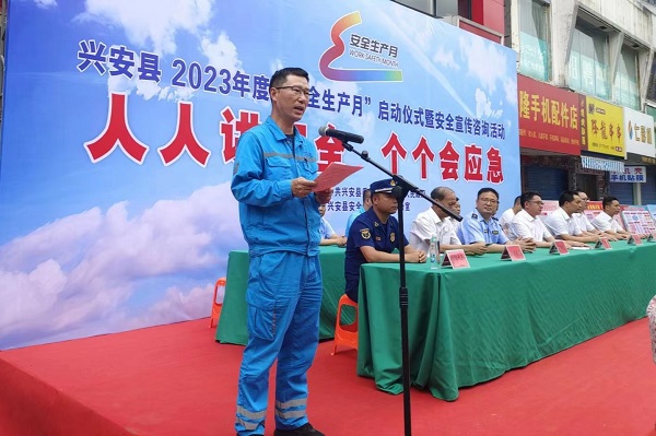 “為認(rèn)真履行企業(yè)主要負(fù)責(zé)人第一責(zé)任人責(zé)任,我承諾:全面落實(shí)安全生產(chǎn)法規(guī)定職責(zé),帶頭研究組織本企業(yè)重大事故隱患排查整治、帶頭落實(shí)全員安全生產(chǎn)崗位責(zé)任,發(fā)揮管理團(tuán)隊和專家作用……堅決防范遏制各類生產(chǎn)安全事故發(fā)生?!?月16日,廣西興安縣安全宣傳咨詢活動現(xiàn)場,興安海螺公司總經(jīng)理任文皓作為全縣企業(yè)代表,作出鄭重承諾。
