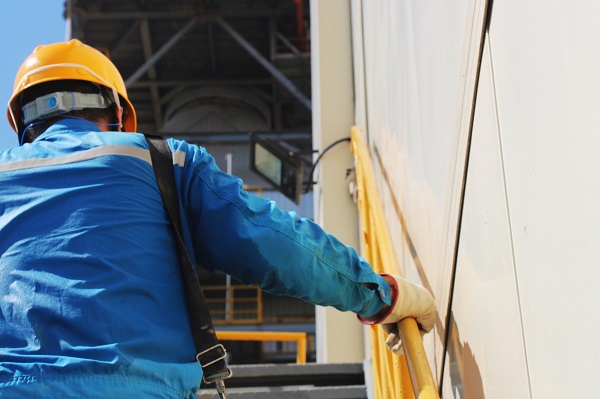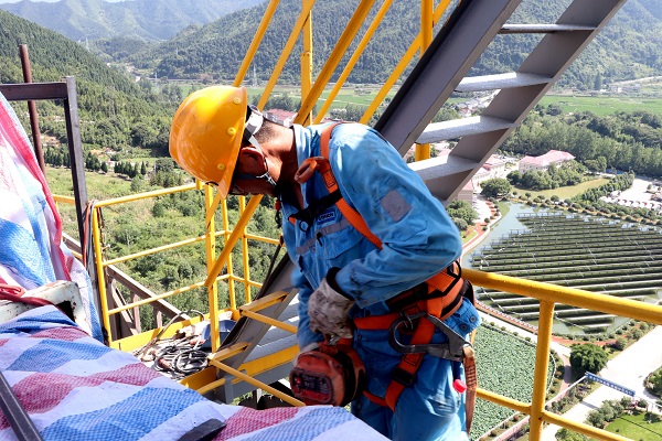 送修完成的電機送達預熱器頂,維修班長張如山正在進行最終吊裝,高處不勝“暑”,卻難擋海螺人火熱的干勁。(王浩然/攝)