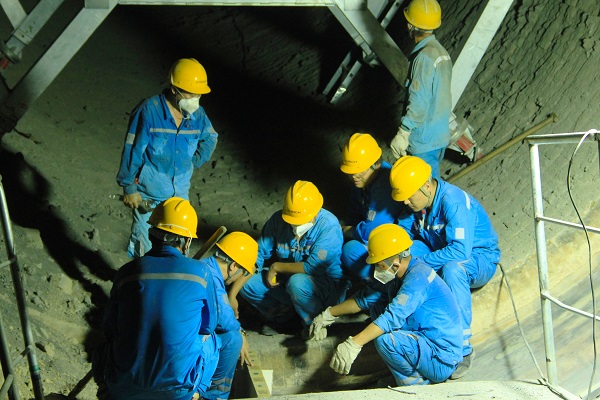 制造二分廠廠長鄭新軍正在4號窯胴體內(nèi)與施工負責人研討耐火磚砌筑方案,你一言、我一語,火熱的環(huán)境見證著海螺人火熱的激情。(王凱/攝)