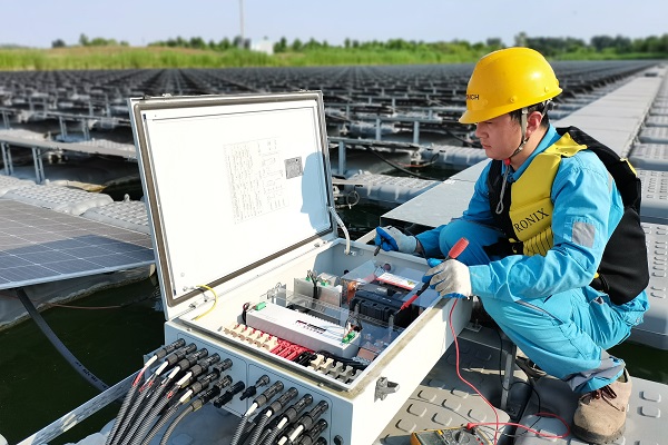 安徽宿州,海螺新能源華陽電站20區(qū)1號逆變器漂浮組件區(qū)域,運維技術(shù)員方星正在對水面光伏匯流箱支路接地故障進行檢查處理。(衛(wèi)任云/攝)