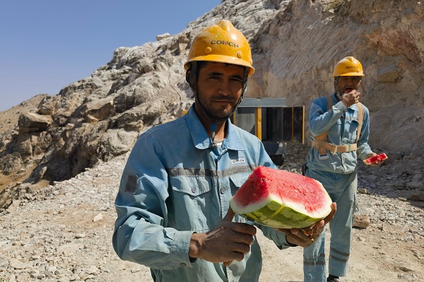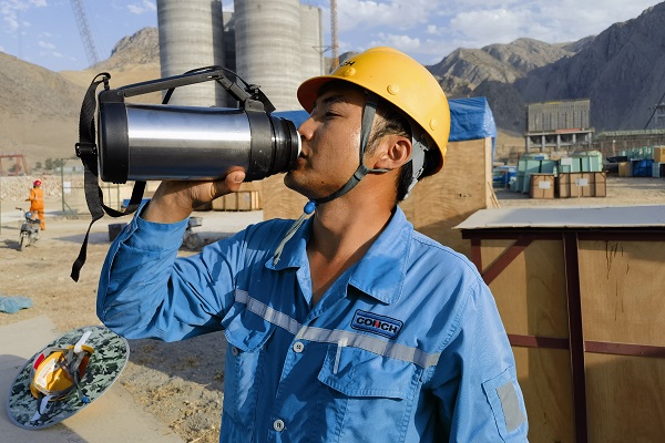 時值高溫時節(jié),中亞腹地干燥炎熱,安集延海螺的工程建設(shè)正如火如荼地進行,一座現(xiàn)代化的水泥工廠正在拔地而起。圖為設(shè)備保全處李開留在完成總降設(shè)備安裝后,正在喝水休憩。(繆明東/攝)