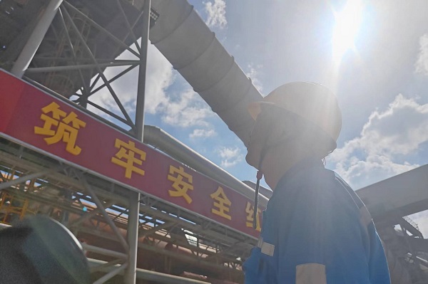 三線預熱器密尾煙室不斷往外噴涌著滾滾熱浪,身著高溫防護服的巡檢員譚平,正在對煙室內(nèi)的結(jié)皮進行清理,保障回轉(zhuǎn)窯穩(wěn)定運行。(秦建明/攝)