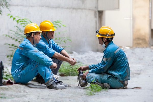 作業(yè)間隙,嚴大慶和工友們在陰涼處稍作休息,討論著安裝方案和注意事項。(曾慶敏/攝)