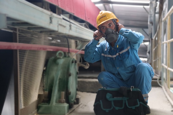 正在前往一線喂料樓的章利,勞保服已被汗水所浸透,干濕分明,手套、安全帽、勞保服在保障員工安全的同時,也見證著海螺人默默的付出。(龍新陽/攝)