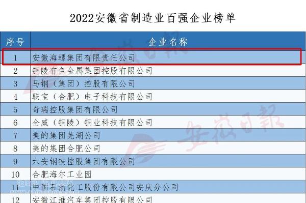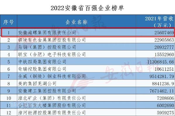 12月12日,安徽省企業(yè)聯(lián)合會、省企業(yè)家聯(lián)合會連續(xù)第18次發(fā)布“2022安徽百強(qiáng)企業(yè)”、“2022安徽制造業(yè)百強(qiáng)企業(yè)”、“2022安徽服務(wù)業(yè)百強(qiáng)企業(yè)”榜單。海螺集團(tuán)名列“2022安徽百強(qiáng)企業(yè)”、“2022安徽制造業(yè)百強(qiáng)企業(yè)”兩項(xiàng)第一。