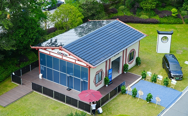 “海螺屋”采用海螺節(jié)能環(huán)保低碳新材料搭建而成,室內(nèi)門窗、地板、家具全部采用海螺新材全屋定制生態(tài)家居,兩側(cè)外墻及屋頂鋪設宣城海螺建筑光伏幕墻與光伏瓦,與建筑完美融為一體?!昂B菸荨痹O計融合了中國與東南亞建筑元素,以及海螺生態(tài)環(huán)保、建筑節(jié)能的理念,整體呈現(xiàn)新中式風格,集中展現(xiàn)了海螺集團RCEP區(qū)域經(jīng)貿(mào)合作新成就,展示了海螺新能源、新材料和數(shù)智發(fā)展新成果、新產(chǎn)品,詮釋了海螺為人類創(chuàng)造未來生活空間的不懈追求。