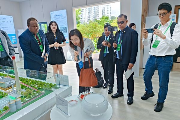 “海螺屋”中間的綠色低碳智慧水泥工廠沙盤科技感、互動感十足,集成展現(xiàn)了水泥生產(chǎn)智能化、無人駕駛、碳捕集利用等先進技術(shù),是近年來海螺推動產(chǎn)業(yè)高端化、智能化、綠色化發(fā)展的一個縮影,沙盤一旁的海螺智慧農(nóng)業(yè)紅櫻桃番茄分外亮眼,吸引前來參觀的領導、外賓品嘗,傾聽海螺綠色低碳發(fā)展背后的精彩故事。