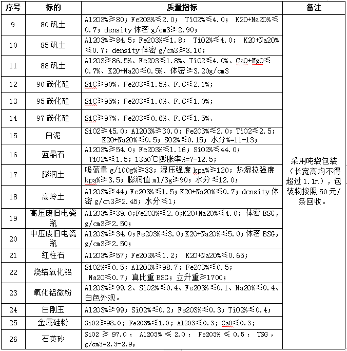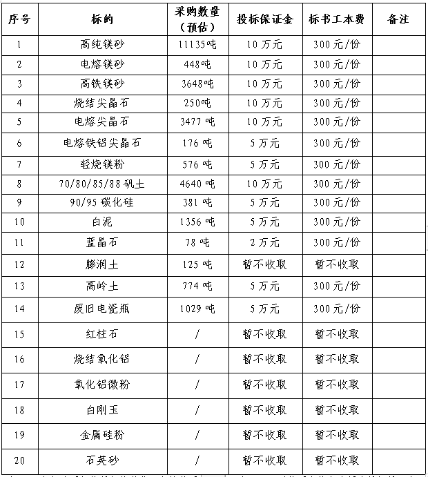 4、上述88礬土、97碳化硅、紅柱石、燒結(jié)氧化鋁、白剛玉、金屬硅粉和石英砂等招標(biāo)采購原材料,因采購量不確定,本次招標(biāo)僅作為本公司采購備用原材料。考慮上述原材料存在無執(zhí)行情況,投標(biāo)保證金、標(biāo)書工本費(fèi)和合同履約保證金暫不收取。