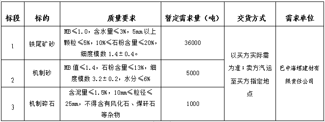 為進(jìn)一步提升鐵尾礦砂及外購砂石招標(biāo)的公平、公正、公開透明性,根據(jù)巴中海螺建材(商混)生產(chǎn)需求情況,現(xiàn)組織開展公開招標(biāo),特將招標(biāo)事宜公告如下:
