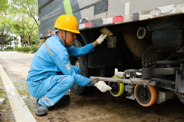 早上六點多,清掃車駕駛員陶師傅對車況進行了例行檢查,即將開始廠區(qū)新一天的梳洗打扮。