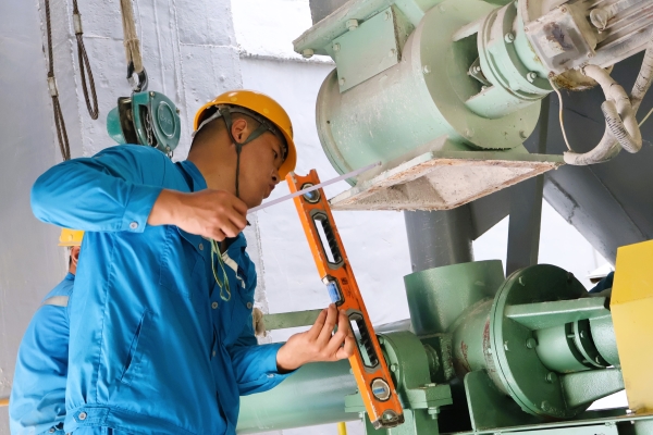 上午九點,制成工段的維修工師傅們,正在對礦粉庫底鉸刀增加安裝螺旋秤。