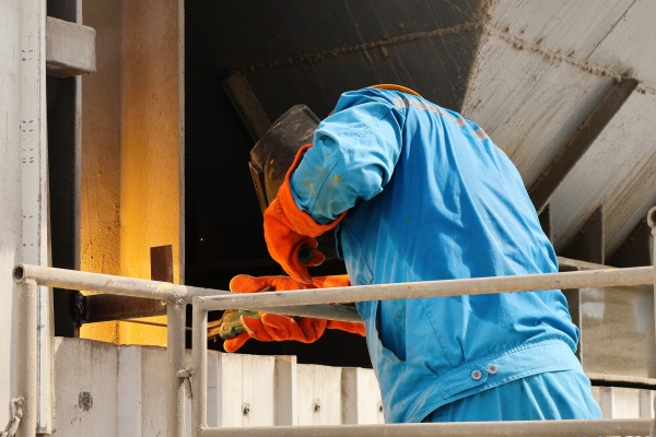 維修工魏師傅剛剛完成了船舶污染物接收管道支架焊接,藍色的工裝早已被汗水浸透。