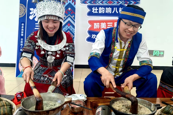 “一口五色糯米飯,吃出山水與情懷”。糯米飯是廣西三月三必吃的小吃之一,壯族家家戶戶都喜歡做五色糯米飯,用于趕歌圩食用,或作祭祖祭神之用,寄托著人們對(duì)五谷豐登、生活美滿的期盼。海螺職工們大顯身手,使用紫葉、紅藍(lán)草、姜黃、楓葉等天然植物制作出紫、紅、黃、黑、綠5種顏色的糯米飯,并巧手制作了海螺造型的擺盤,糯米飯香氣四溢,用味蕾感受“三月三”的壯族風(fēng)情。