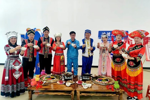 “茶葉青青姜片黃,木槌聲聲敲出香。瑤鄉(xiāng)煙火煮春意,一碗油茶暖時(shí)光”。參加“三月三油茶宴”的職工們將茶葉、生姜、大蒜等食材放入特制的油茶鍋中,用木槌反復(fù)捶打,直到食材變成糊狀。在鍋中加入食用油,將捶打好的食材炒香。加入熱水煮沸,過(guò)濾出茶湯。將茶湯倒入碗中,加入炒米、花生、蔥花、香菜等配料,一碗碗熱氣騰騰、濃郁醇香的油茶就出鍋了,再配上海螺職工們親手制作的象征著驅(qū)邪避災(zāi)、健康平安、團(tuán)圓和幸福的艾葉糍粑、粽子等,三月三美食體驗(yàn)感直線拉滿。