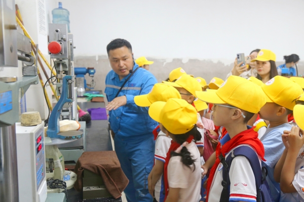 泛滿藍色燈光的中控室內(nèi),科技感拉滿,孩子們被眼前景象所震撼,數(shù)十塊電子屏閃爍著數(shù)據(jù)和圖表,仿佛是工業(yè)“大腦”;遍布精密儀器設(shè)備的實驗室內(nèi),孩子們圍觀著機械臂精準(zhǔn)抓取樣品的操作,仿佛置身魔術(shù)表演空間,“這機械手臂可以幫我批改作業(yè)嗎?”突然一句天真無邪的話讓整個場景變得趣味橫生!