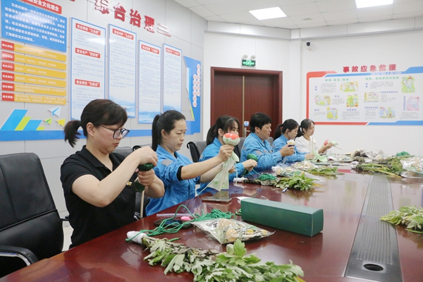 大家先將新鮮的艾草與菖蒲精心搭配,再用寓意吉祥的五彩繩細細捆扎。有的職工別出心裁地在門掛上系上親手縫制的香囊,有的則用工整的字跡在紅紙上寫下“平安順遂”的祝福語掛在艾草枝頭,大家精心捆扎的端午門掛各具特色。有的職工將做好的艾草錘送給長期伏案的同事希望能幫助他緩解疲勞。還有人打算把門掛掛在班組的大門上,希望2025年工作順順利利。