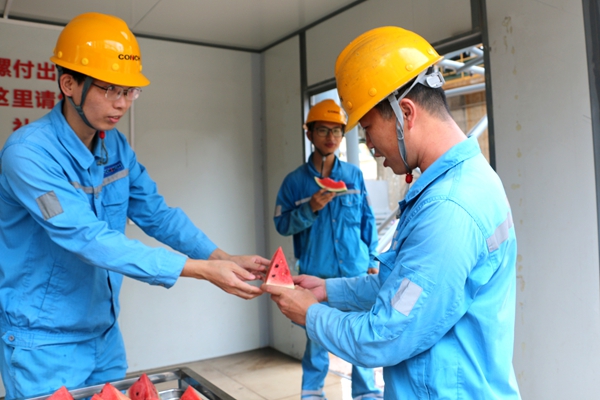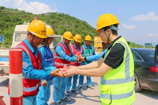 “大家辛苦了!一定要注意勞逸結(jié)合?!惫?/span>慰問(wèn)組反復(fù)叮囑各班組長(zhǎng)科學(xué)調(diào)配作業(yè)時(shí)間,礦山分廠爆破安全員熊師傅接過(guò)鹽汽水,臉上洋溢著笑容:“公司這么關(guān)心我們,這份清涼來(lái)得太及時(shí)了,我們一定加倍努力,保障生產(chǎn)安全高效!”