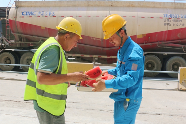 慰問(wèn)組先后前往窯中廣場(chǎng)、礦山爆破區(qū)、水泥發(fā)運(yùn)等高溫作業(yè)點(diǎn),將精心準(zhǔn)備的鹽汽水、綠豆湯、西瓜等防暑降溫物資送到員工手中,確保一線員工在高溫環(huán)境下能夠及時(shí)補(bǔ)充水分、預(yù)防中暑。期間公司安全環(huán)保處還現(xiàn)場(chǎng)開(kāi)展了高溫作業(yè)安全培訓(xùn)、夏季中暑應(yīng)急演練,重點(diǎn)強(qiáng)調(diào)“避開(kāi)午間高溫時(shí)段”“輪換作業(yè)”“穿戴防護(hù)裝備”等事項(xiàng),設(shè)備保全處對(duì)生產(chǎn)現(xiàn)場(chǎng)的所有空調(diào)、風(fēng)扇、通風(fēng)設(shè)備進(jìn)行全面檢修,確保降溫設(shè)施正常運(yùn)行。辦公室廣泛聽(tīng)取一線員工對(duì)防暑降溫工作的建議,進(jìn)一步優(yōu)化高溫保障措施,切實(shí)保障員工夏季作業(yè)安全。